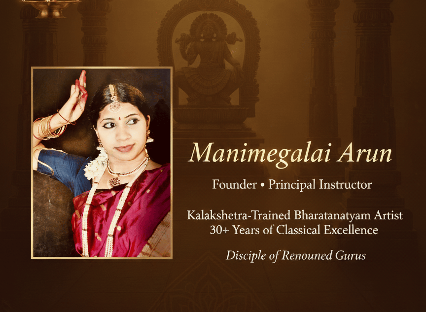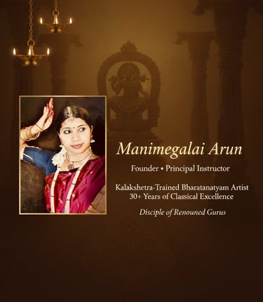 From the age of three, Smt. Manimegalai Arun has been immersed in the world of Bharatanatyam a journey that began with innocent curiosity and blossomed into a lifelong commitment to the classical arts. Raised in an environment where culture, discipline, and devotion were deeply valued, Bharatanatyam became not just a passion but an integral part of her identity.
